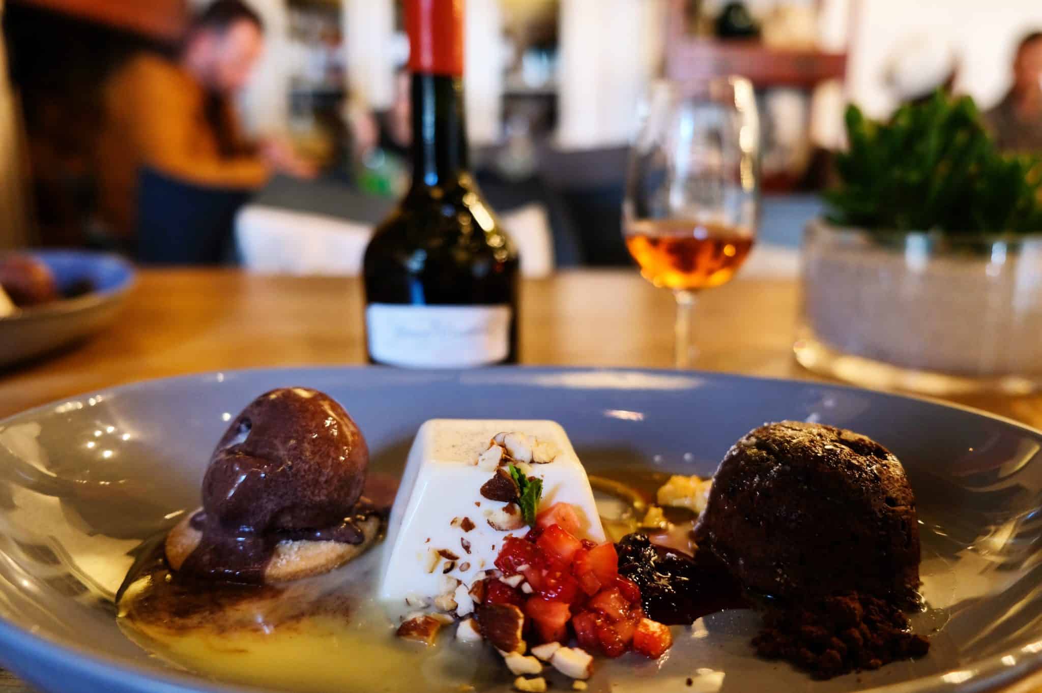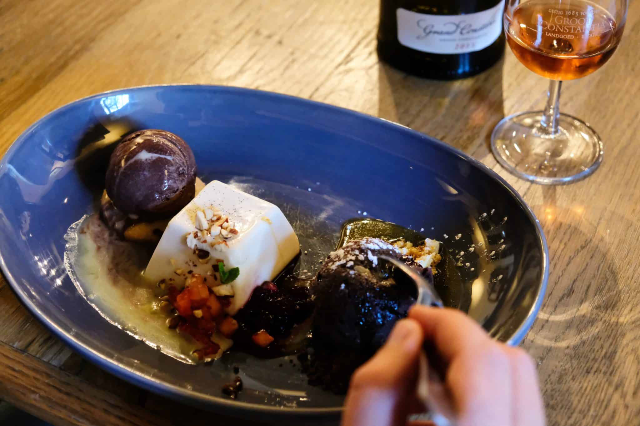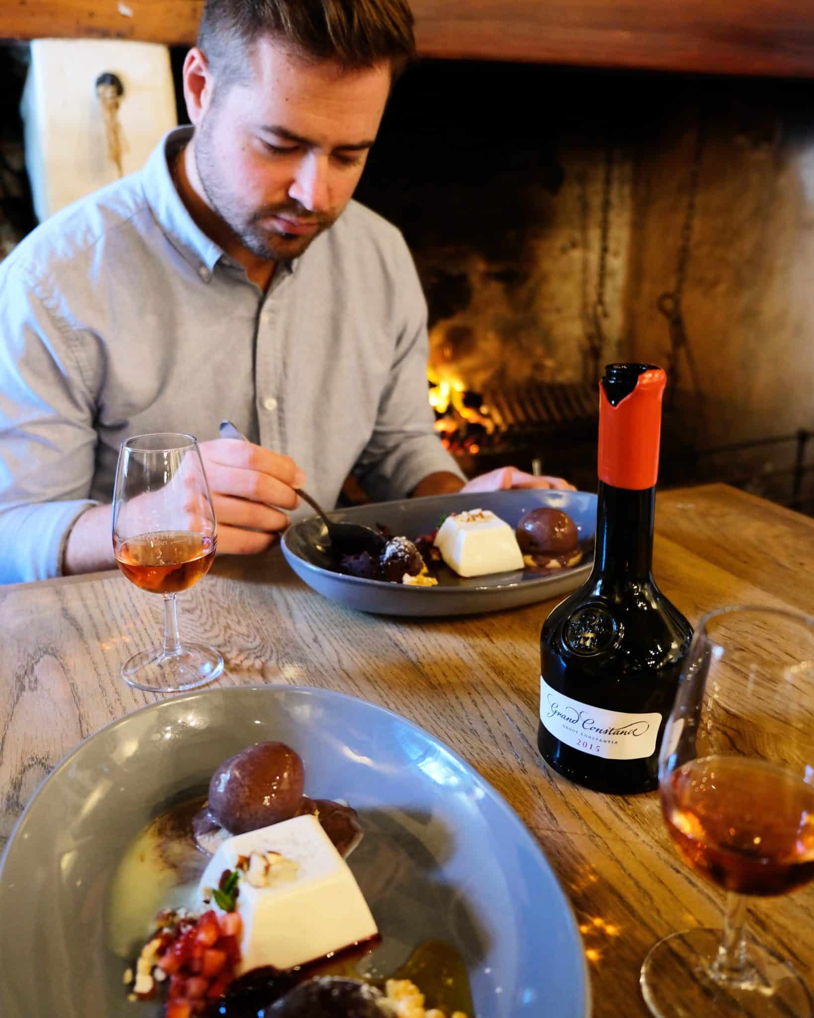The soaking-wet gravel crunched under foot as we walked along the oak lined avenue towards Jonkershuis Restaurant. It was mid-afternoon on this typical autumn day and the rain had been falling gently for the past two hours. There was a definite icy chill in the air which ensured we moved hurriedly to get indoors. Welcomed by the sound of wood crackling in the fireplace, our little table was nestled cosily in the historic building. We were at Jonkershuis Restaurant for a reason: to pair the silky smooth Grand Constance with the eatery’s decadent desserts.