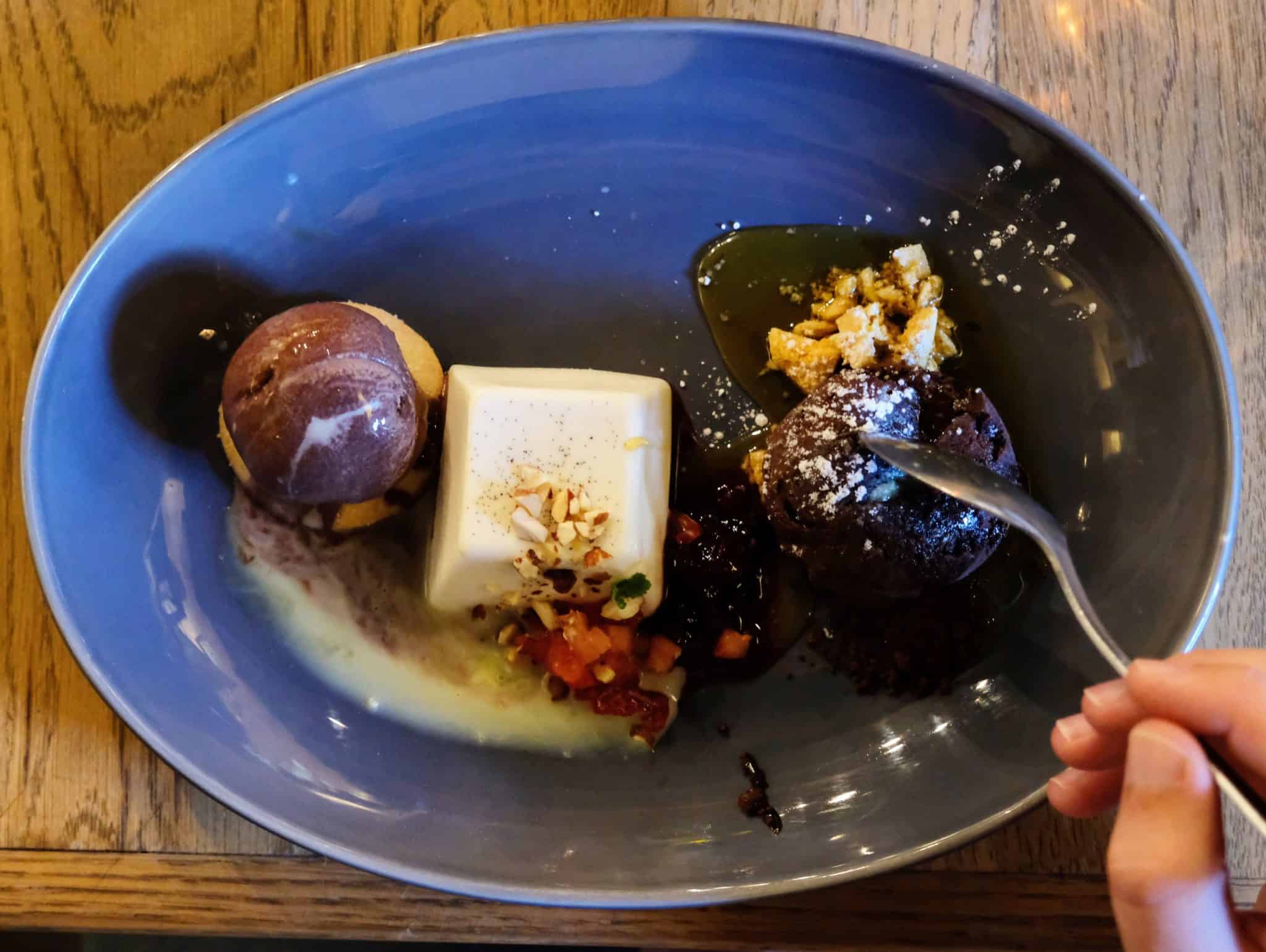 Our trio of chocolate treats accompanied a glass of Grand Constance superbly. The warm dark chocolate fondant melts in your mouth with an intense explosion of rich chocolate flavours. The white chocolate Panna Cotta with fresh strawberry and almonds complimented the natural sweet Grand Constance excellently. Rounding off the trio was the lavender biscuit topped with dark chocolate ice cream, another winner. This trio is usually available at functions and with set menu offerings – reason enough to host a dinner party here!