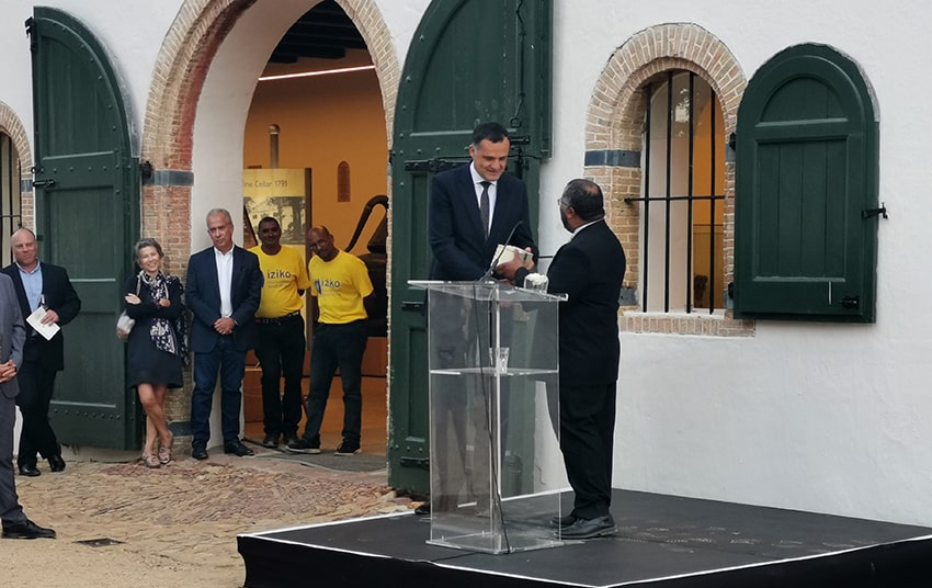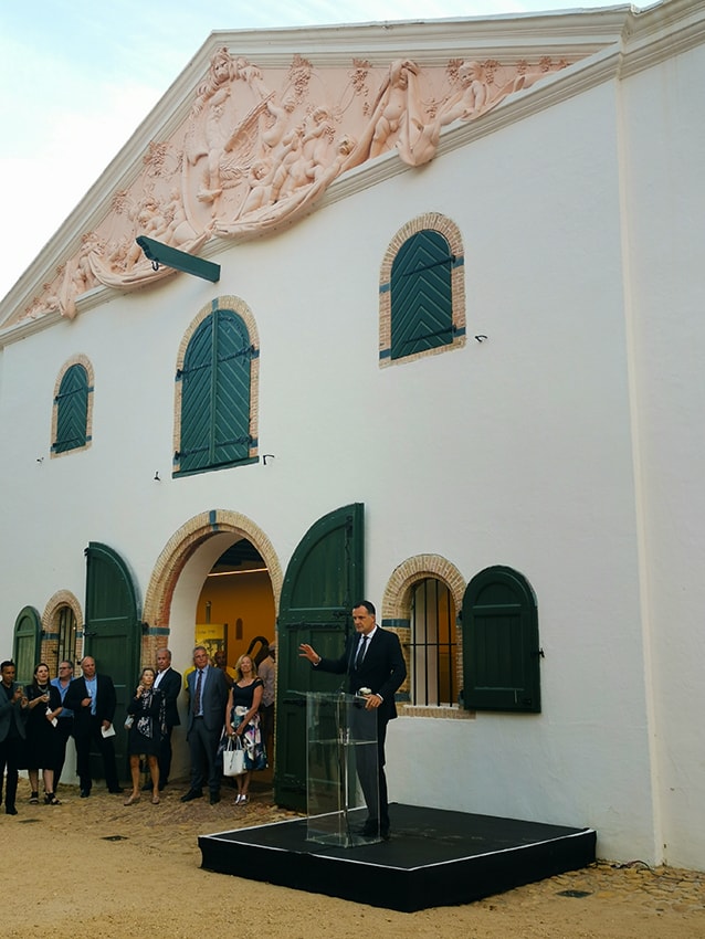 Low tables and chairs dot the area outside the Cloete Cellar overlooking the ponds and long tables are replete with sparking glasses and an array of Constantia wines. Dignitaries and invited guests were treated fine wines accompanied by delectable canapes from the Jonkershuis restaurant. As the sun began to set the mountains and vineyards were bathed in gold, fairy lights add to the festiveness of the occasion and guests sip, taste, mingle and chat before the speeches and the official opening of the Wine of Exile exhibition. Darkness fell and guests wandered inside the Cloete Cellar to look at the exhibits or enjoyed the coolness of the evening air, lingering as long as possible at this exquisite and historic venue.