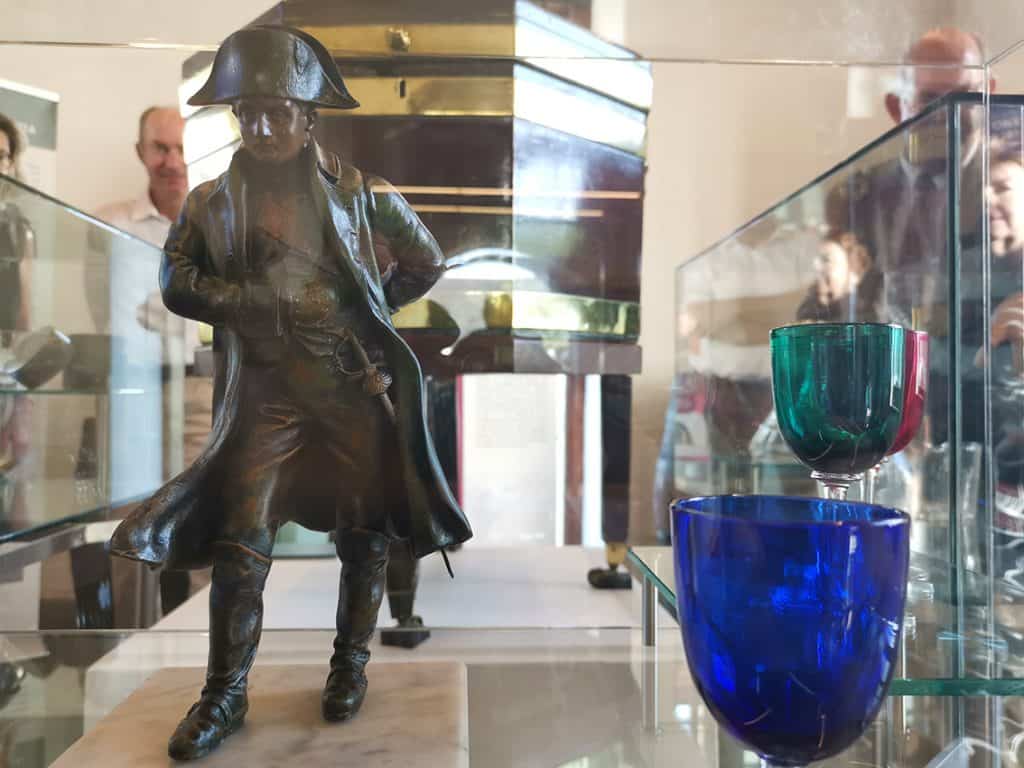 The Cloete Cellar at Groot Constantia is where you will find the Wine of Exile exhibits which include some fascinating relics and documents. A collection of cut glass crystal wine goblets and glasses, an exquisite glass decanter made especially for use on board a ship with a wide base and sloping side for better stability, drawings, notes and personalized items of Napoleon stamped with his initials.