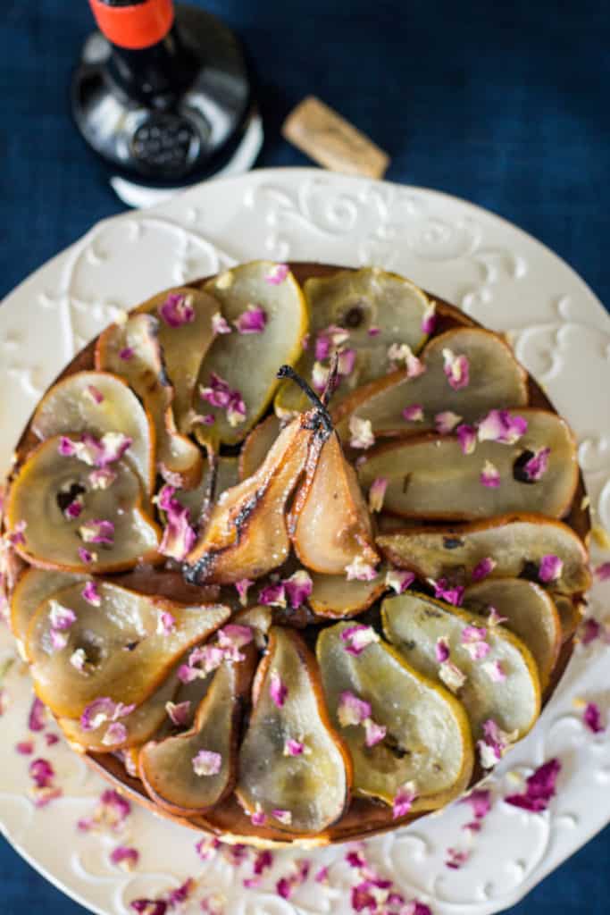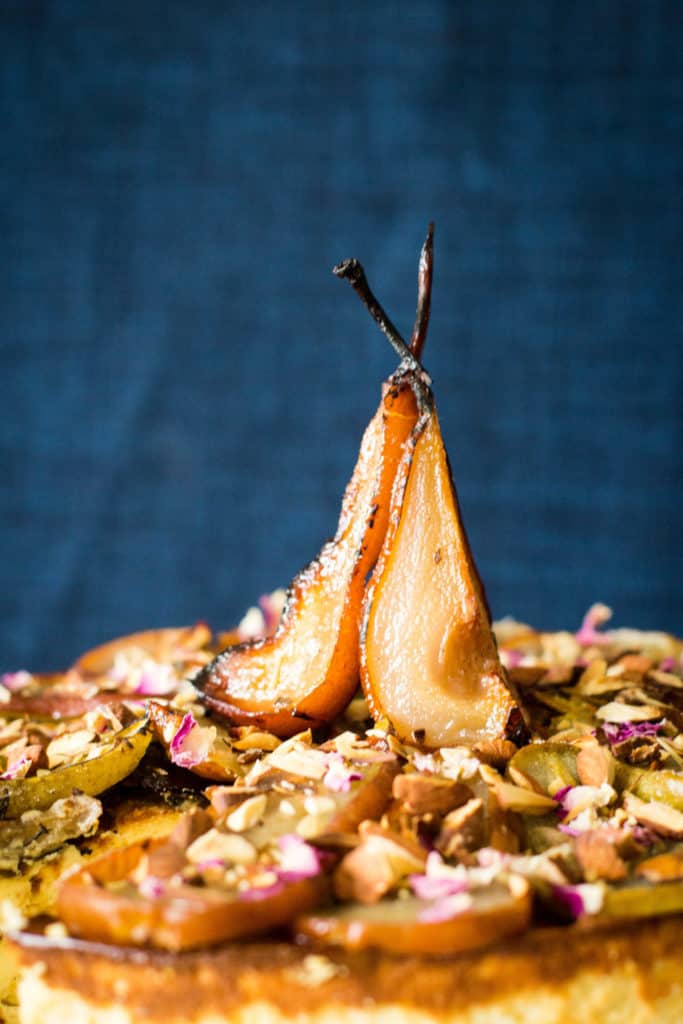 On the day of serving, take the pears that have been set aside to top the cheesecake and arrange on top of the cake in any pattern you wish. Sprinkle over the roasted flaked almonds and to garnish for colour some dried rose petals. For extra effect, add caster sugar on top of the pears and using a blow torch brulee until sugar caramelizes.